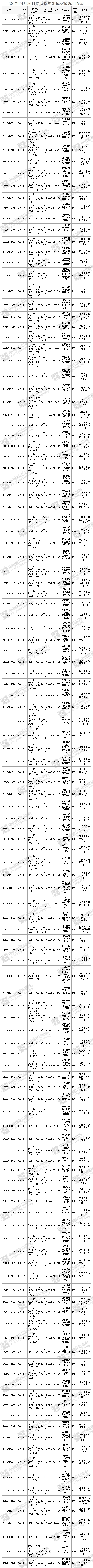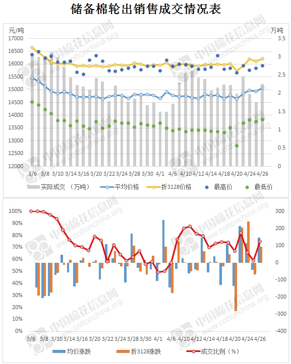 4月26日儲備棉輪出銷售資源29975.319噸,實際成交22452.958噸,成交率74.90%。當(dāng)日最高成交價15940元/噸(2013年度新疆棉),最低成交價13840元/噸(2013年度地產(chǎn)棉)。成交平均價格15075元/噸(較前一日價格漲148元/噸);折3128價格:16212元/噸(較前一日價格漲93元/噸)。當(dāng)日單捆最高加價1820元/噸(2013年度新疆棉),單捆最低加價20元/噸(2011年度地產(chǎn)棉1捆;2012年度地產(chǎn)棉10捆;2013年度地產(chǎn)棉5捆)。