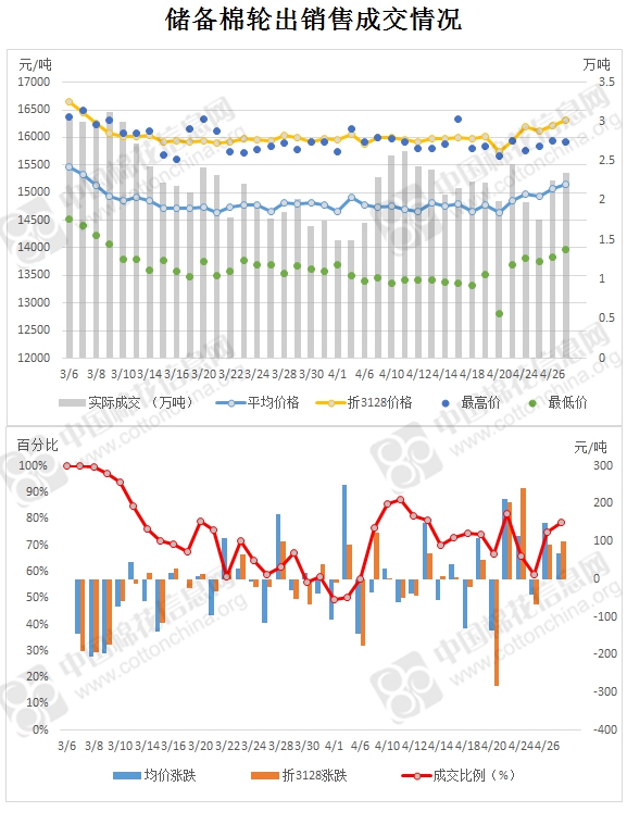 4月27日儲(chǔ)備棉輪出銷售資源29919.591噸,實(shí)際成交23527.444噸,成交率78.64%。當(dāng)日最高成交價(jià)15910元/噸(2012年度新疆棉),最低成交價(jià)13960元/噸(2013年度地產(chǎn)棉)。成交平均價(jià)格15144元/噸(較前一日價(jià)格漲69元/噸);折3128價(jià)格:16312元/噸(較前一日價(jià)格漲100元/噸)。當(dāng)日單捆最高加價(jià)1920元/噸(2013年度新疆棉),單捆最低加價(jià)20元/噸(2011年度地產(chǎn)棉1捆;2012年度地產(chǎn)棉11捆;2013年度地產(chǎn)棉6捆)。