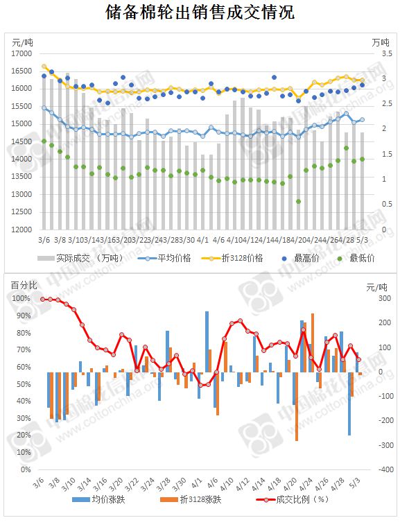 5月3日儲備棉輪出銷售資源29996.176噸,實際成交19368.69噸,成交率64.57%。當日最高成交價16120元/噸(2012年度新疆棉),最低成交價14000元/噸(2013年度地產(chǎn)棉)。成交平均價格15053元/噸(較前一日價格漲81元/噸);折3128價格:16250元/噸(較前一日價格跌11元/噸)。當日單捆最高加價1460元/噸(2013年度新疆棉),單捆最低加價20元/噸(2012年度地產(chǎn)棉1捆;2012年度地產(chǎn)棉9捆;2013年度地產(chǎn)棉12捆)。