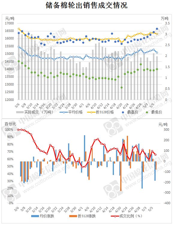 5月8日儲(chǔ)備棉輪出銷售資源29983.025噸,實(shí)際成交19853.912噸,成交率66.22%。當(dāng)日最高成交價(jià)16650元/噸(2012年度新疆棉),最低成交價(jià)14010元/噸(2011年度地產(chǎn)棉)。成交平均價(jià)格15099元/噸(較前一日價(jià)格跌184元/噸);折3128價(jià)格:16310元/噸(較前一日價(jià)格跌79元/噸)。當(dāng)日單捆最高加價(jià)1840元/噸(2012年度新疆棉),單捆最低加價(jià)20元/噸(2012年度地產(chǎn)棉5捆;2013年度地產(chǎn)棉6捆)。