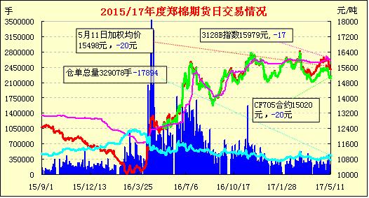 5月11日隔夜鄭棉盤跌,今日早盤慣性下滑后在空頭回補推動下回升,午后橫向震蕩,日線形成陰線星。日內(nèi)成交量萎縮,持倉量減少。基本面情況:現(xiàn)貨市場觀望心態(tài)增濃,紡企多剛需零星采購,江蘇地區(qū)疆棉3128/29級價16000-16300毛重,部分公定結(jié)算。強力28以上價格在16500-16800元/噸毛重。長絨棉市場相對維持,商家低價惜售,整體庫存消化緩慢,阿克蘇站臺137級長絨棉毛重報價在21000元/噸左右,質(zhì)優(yōu)的報價在21600-22000元/噸。目前部分新疆地區(qū)新棉播種結(jié)束,進度雖緩慢,但出苗良好,整體長絨棉種植面積減少明顯。