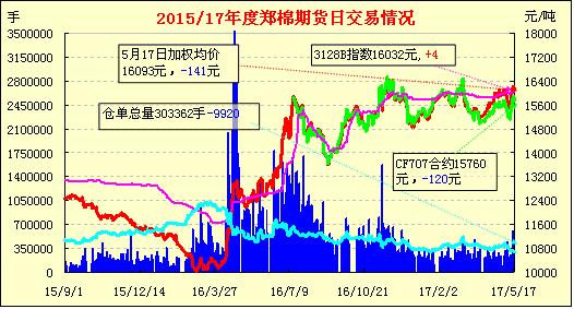5月17日隔夜鄭棉盤整后下滑,今日盤中在空頭回補(bǔ)支撐下回升,日線形成星線。日內(nèi)成交量萎縮,持倉量減少。基本面情況:現(xiàn)貨市場調(diào)整,新疆喀什地區(qū)3128/29級站臺提貨價(jià)在15800-16200元/噸毛重,質(zhì)優(yōu)價(jià)更高,高低等級價(jià)差較大,實(shí)際商談尚可。河北、山東等地3128級地產(chǎn)價(jià)格維持在15400-15500元/噸毛重提貨、4128級在15000元/噸附近。多數(shù)紗廠出現(xiàn)抱怨,目前棉花價(jià)格堅(jiān)挺,但棉紗市場出現(xiàn)走淡。