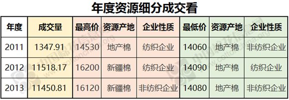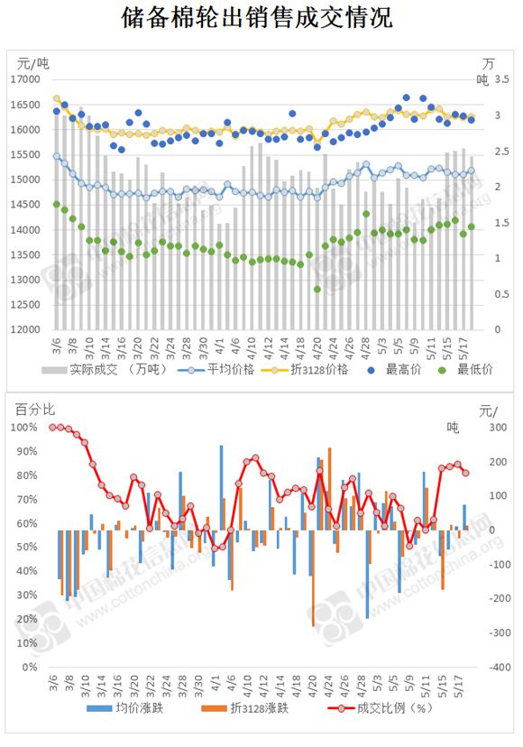 5月18日儲(chǔ)備棉輪出銷售資源29986.188噸,實(shí)際成交24316.882噸,成交率81.09%。當(dāng)日最高成交價(jià)16200元/噸(2012年度新疆棉),最低成交價(jià)14060元/噸(2011年度地產(chǎn)棉)。成交平均價(jià)格15190元/噸(較前一日價(jià)格漲75元/噸);折3128價(jià)格:16266元/噸(較前一日價(jià)格漲13元/噸)。當(dāng)日單捆最高加價(jià)1760元/噸(2012年度新疆棉),單捆最低加價(jià)20元/噸(2011年度地產(chǎn)棉2捆;2012年度地產(chǎn)棉10捆;2013年度地產(chǎn)棉9捆)。