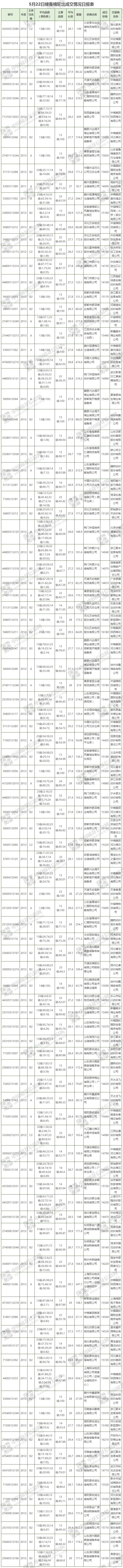 5月22日儲(chǔ)備棉輪出銷售資源29946.847噸,實(shí)際成交18445.814噸,成交率61.60%。當(dāng)日最高成交價(jià)16310元/噸(2012年度新疆棉),最低成交價(jià)13980元/噸(2011年度地產(chǎn)棉)。成交平均價(jià)格15346元/噸(較前一日價(jià)格漲245元/噸);折3128價(jià)格:16474元/噸(較前一日價(jià)格漲231元/噸)。當(dāng)日單捆最高加價(jià)1340元/噸(2012年度新疆棉),單捆最低加價(jià)20元/噸(2012年度地產(chǎn)棉8捆;2013年度地產(chǎn)棉2捆)。