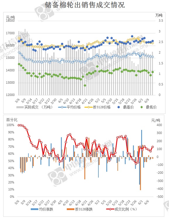 2017年3月6日至6月8日,儲備棉輪出累計(jì)成交140萬噸,成交率70.38%。
