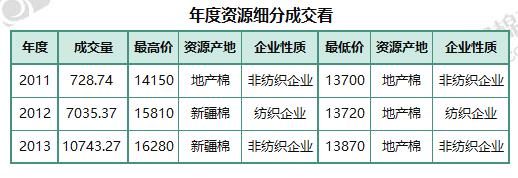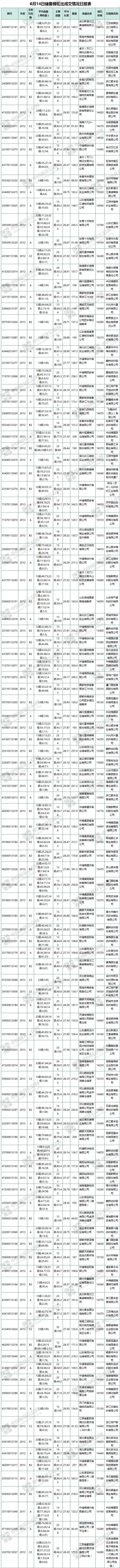 6月14日儲備棉輪出銷售資源30332.05噸,實際成交18507.385噸,成交率61.02%。當日最高成交價16280元/噸(2013年度新疆棉),最低成交價13700元/噸(2011年度地產(chǎn)棉)。成交平均價格14827元/噸(較前一日價格跌167元/噸);折3128價格:16043元/噸(較前一日價格跌170元/噸)。當日單捆最高加價1660元/噸(2013年度新疆棉),單捆最低加價20元/噸(2011年度地產(chǎn)棉1捆,2012年度地產(chǎn)棉15捆,2013年度地產(chǎn)棉8捆)。紡織企業(yè)家數(shù)占比:59.46%,非紡織企業(yè)家數(shù)占比:40.54%。