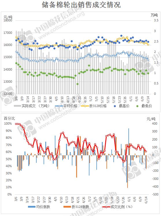 2017年3月6日至6月14日,儲備棉輪出累計成交148萬噸,成交率70.03%。