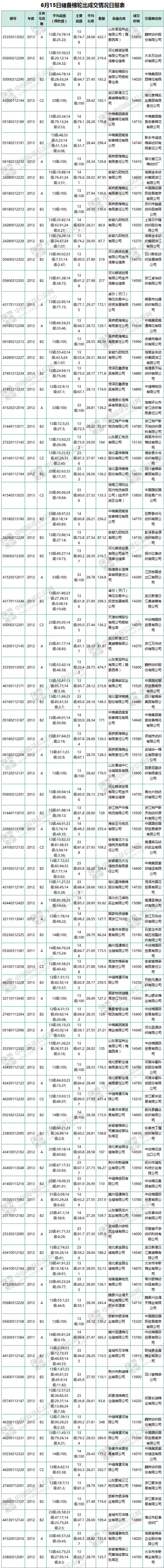 6月15日儲備棉輪出銷售資源29871.925噸,實(shí)際成交14197.401噸,成交率47.53%。當(dāng)日最高成交價15990元/噸(2012年度新疆棉),最低成交價13690元/噸(2012年度地產(chǎn)棉)。成交平均價格14834元/噸(較前一日價格漲7元/噸);折3128價格:16059元/噸(較前一日價格漲16元/噸)。當(dāng)日單捆最高加價1240元/噸(2013年度新疆棉),單捆最低加價20元/噸(2012年度地產(chǎn)棉9捆,2013年度地產(chǎn)棉5捆)。紡織企業(yè)家數(shù)占比:55.74%,非紡織企業(yè)家數(shù)占比:44.26%。