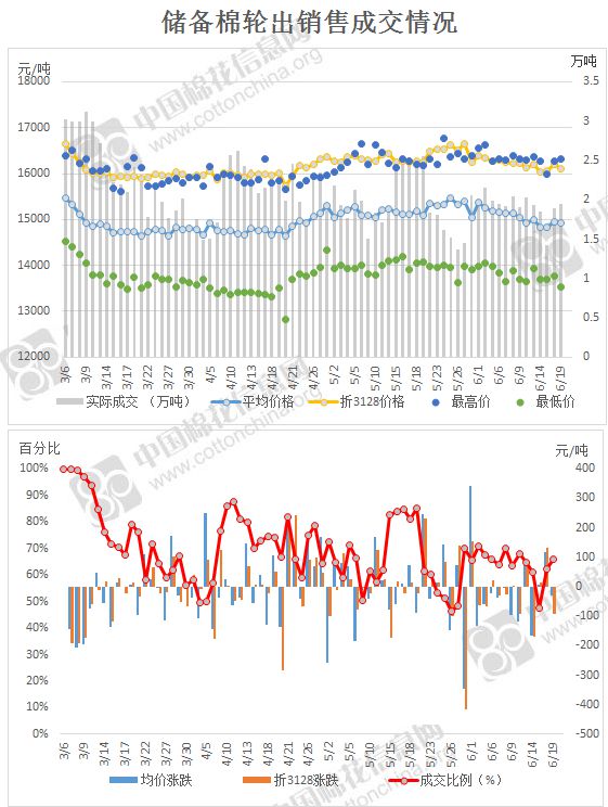2017年3月6日至6月19日,儲備棉輪出累計成交153萬噸,成交率69.57%。