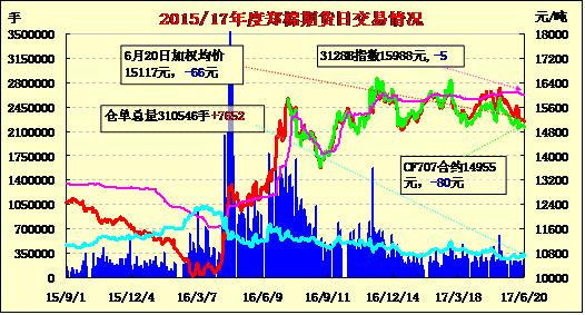 6月20日隔夜鄭棉盤整,今日早盤增倉(cāng)下滑,盤中低位震蕩,午后在多頭買盤推動(dòng)下回升,日線形成長(zhǎng)下影線的陰線星。日內(nèi)成交量放大,持倉(cāng)量增加。基本面情況:這幾日棉紗市場(chǎng)穩(wěn)中偏淡,市場(chǎng)心態(tài)持續(xù)低落,棉紡廠出貨占據(jù)主導(dǎo),中間商家信心已一層一層被瓦解。據(jù)一些業(yè)內(nèi)人士反映,主要還是缺少下游足夠消耗量的支持,紗廠已普遍有存貨,資金周轉(zhuǎn)也漸不靈。目前因棉花持續(xù)動(dòng)蕩不穩(wěn),如鄭棉期貨市場(chǎng)6月12日CF707收于15100元/噸,6月14日CF707收于15020元/噸,5月16日CF707收于15000元/噸?,F(xiàn)貨市場(chǎng)成交不理想,報(bào)價(jià)方面雖多穩(wěn),但實(shí)際價(jià)格穩(wěn)中小跌,現(xiàn)內(nèi)地329級(jí)皮棉主流提貨報(bào)價(jià)15800-15900元/噸左右,長(zhǎng)絨棉價(jià)格相對(duì)穩(wěn)中堅(jiān)持,阿克蘇137級(jí)主流提貨報(bào)價(jià)22000元/噸左右。而現(xiàn)對(duì)于棉紡廠家來(lái)說(shuō),利潤(rùn)空間不斷被擠壓,只能薄利經(jīng)營(yíng)。現(xiàn)紹興錢清市場(chǎng)32s、普梳用紗主流價(jià)為23200元/噸,32S高配主流23900元/噸,40s精梳較低價(jià)為27000元/噸,60/s精密紡主流為34000-34500元/噸左右。