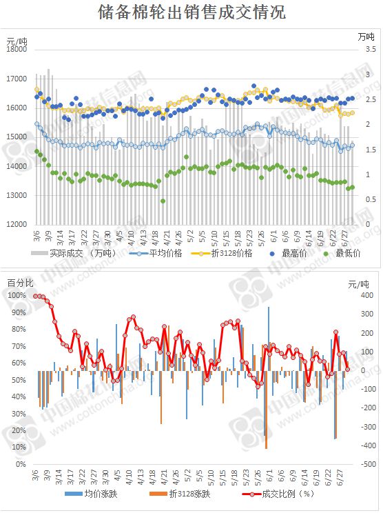 2017年3月6日至6月29日,儲備棉輪出累計成交168萬噸,成交率68.97%。