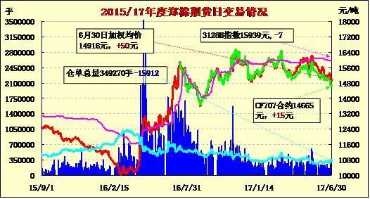 6月30日隔夜鄭棉反彈,今日盤(pán)中在空頭賣盤(pán)打壓下走低,CF17909合約日線形成陰線星,CF1801日線形成小陰線。日內(nèi)成交量略減,持倉(cāng)量增加。基本面情況:現(xiàn)貨市場(chǎng)穩(wěn)定,江蘇地區(qū)疆棉3128/29級(jí)報(bào)價(jià)在15800-16200元/噸左右強(qiáng)力26-27,紡企采購(gòu)謹(jǐn)慎,實(shí)際成交相對(duì)有限,多偏向國(guó)儲(chǔ)棉。而疆棉市場(chǎng)相對(duì)略堅(jiān)挺,阿克蘇等地手摘雙28、29級(jí)價(jià)格在15700-15900元/噸毛重。整體市場(chǎng)心態(tài)不佳,看淡后期占據(jù)主導(dǎo)。