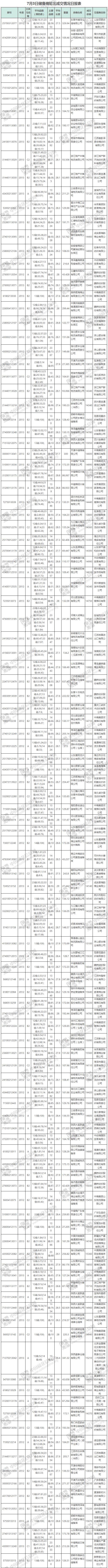 7月3日儲(chǔ)備棉輪出銷售資源29625.653噸,實(shí)際成交18377.544噸,成交率62.03%。當(dāng)日最高成交價(jià)16040元/噸(2013年度新疆棉),最低成交價(jià)12990元/噸(2013年度地產(chǎn)棉)。成交平均價(jià)格14765元/噸(較前一日價(jià)格漲40元/噸);折3128價(jià)格:15938元/噸(較前一日價(jià)格漲58元/噸)。當(dāng)日單捆最高加價(jià)1960元/噸(2013年度新疆棉),單捆最低加價(jià)20元/噸(2012年度地產(chǎn)棉8捆,2013年度地產(chǎn)棉9捆)。紡織企業(yè)家數(shù)占比:57.81%,非紡織企業(yè)家數(shù)占比:42.19%。