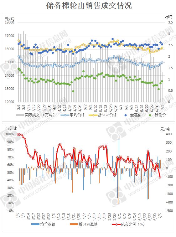 2017年3月6日至7月5日,儲備棉輪出累計成交174萬噸,成交率68.11%。