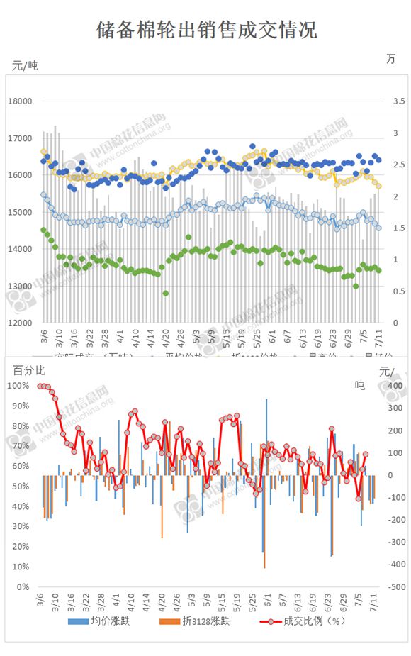 2017年3月6日至7月11日,儲(chǔ)備棉輪出累計(jì)成交182.2萬噸,成交率68.02%。