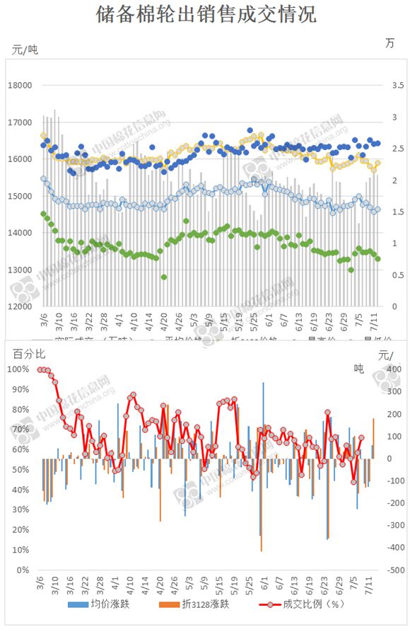 2017年3月6日至7月12日,儲備棉輪出累計成交184.3萬噸,成交率68.04%。