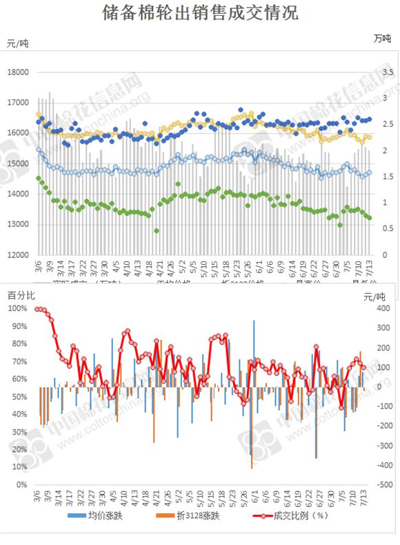 7月13日儲備棉輪出銷售資源30045.522噸,實際成交20090.501噸,成交率66.87%。當日最高成交價16470元/噸(2013年度地產(chǎn)棉),最低成交價13220元/噸(2013年度地產(chǎn)棉)。成交平均價格14716元/噸(較前一日價格漲76元/噸);折3128價格:15875元/噸(較前一日價格跌19元/噸)。當日單捆最高加價2380元/噸(2013年度新疆棉),單捆最低加價20元/噸(2012年度地產(chǎn)棉6捆,2013年度地產(chǎn)棉10捆)。紡織企業(yè)家數(shù)占比:45.12%,非紡織企業(yè)家數(shù)占比:54.88%。