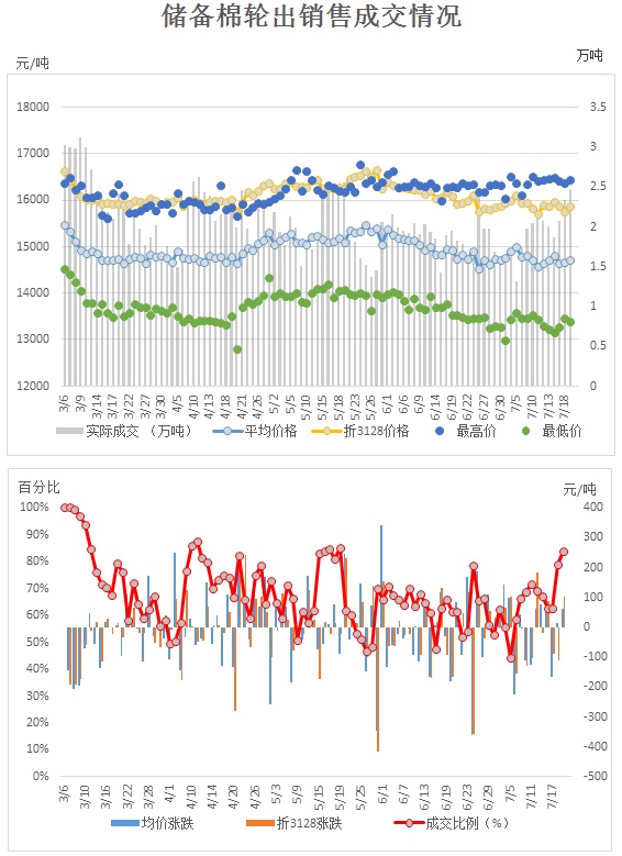 2017年3月6日至7月19日,儲備棉輪出累計成交195.04萬噸,成交率68.25%。