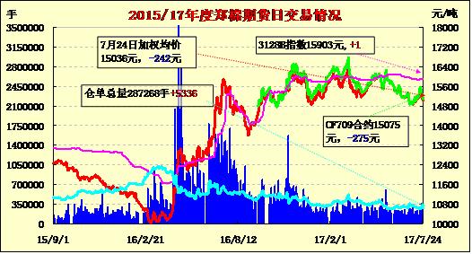 7月24日隔夜鄭棉CF1801下試回升,今日盤中增倉上試,午后減倉調(diào)整,日線形成陽線星。日內(nèi)成交量萎縮,持倉量近增遠減?;久媲闆r:河北滄縣一位棉農(nóng)介紹,周末兩天,當(dāng)?shù)仃懤m(xù)地下了2-3場雨,雨后田間查看,田里略有積水。正是這次降雨,在很大程度上給干渴的棉田解了渴。與此同時,滄州下屬的河間、吳橋、東光、獻縣等幾個產(chǎn)棉縣也是棉田潤澤,棉花長勢較好。