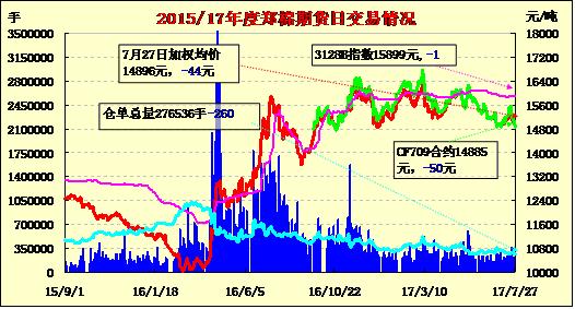 7月27日隔夜鄭棉CF1801合約盤跌,今日早盤在平倉盤壓制下快速下滑,隨后增倉震蕩,午后減倉下跌,日線形成陰線。日內(nèi)成交量放大,持倉量減少?;久媲闆r:現(xiàn)貨市場調(diào)整,河北等地地產(chǎn)3128級提貨價格在15300-15400元/噸毛重,疆棉方面雙28級手摘價格在16200-16300元/噸,實單交易一般,受拋儲延期及疆棉增多消息影響,市場觀望心態(tài)增濃,部分紡企反映,原本預計近段時間多補點庫存已備9月份使用,但如果拋儲延期落實,則并需要補貨了,這兩天先看看情況隨時可能調(diào)整其計劃。
