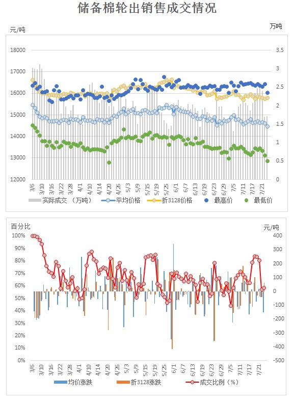 2017年3月6日至7月25日,儲(chǔ)備棉輪出累計(jì)成交203.38萬(wàn)噸,成交率68.32%。