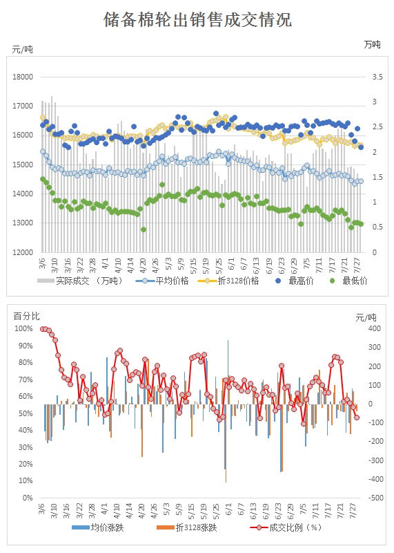 7月28日儲(chǔ)備棉輪出銷售資源29870.235噸,實(shí)際成交14245.015噸,成交率47.69%。當(dāng)日最高成交價(jià)15620元/噸(2012年度新疆棉),最低成交價(jià)12990元/噸(2013年度地產(chǎn)棉)。成交平均價(jià)格14453元/噸(較前一日價(jià)格漲3元/噸);折3128價(jià)格:15679元/噸(較前一日價(jià)格跌37元/噸)。當(dāng)日單捆最高加價(jià)2160元/噸(2013年度新疆棉),單捆最低加價(jià)20元/噸(2011年度地產(chǎn)棉1捆,2012年度地產(chǎn)棉9捆,2013年度地產(chǎn)棉2捆)。紡織企業(yè)家數(shù)占比:52.38%,非紡織企業(yè)家數(shù)占比:47.62%。