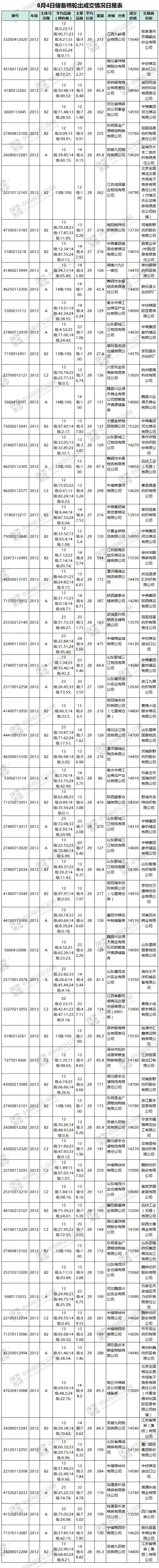 8月4日儲(chǔ)備棉輪出銷售資源29869.699噸,實(shí)際成交11446.003噸,成交率38.32%。當(dāng)日最高成交價(jià)15790元/噸(2012年度新疆棉),最低成交價(jià)12930元/噸(2012年度地產(chǎn)棉)。成交平均價(jià)格14586元/噸(較前一日價(jià)格漲14元/噸);折3128價(jià)格:15721元/噸(較前一日價(jià)格跌100元/噸)。當(dāng)日單捆最高加價(jià)1840元/噸(2013年度新疆棉),單捆最低加價(jià)20元/噸(2012年度地產(chǎn)棉7捆;2013年度地產(chǎn)棉2捆)。紡織企業(yè)家數(shù)占比:54.90%,非紡織企業(yè)家數(shù)占比:45.1%。