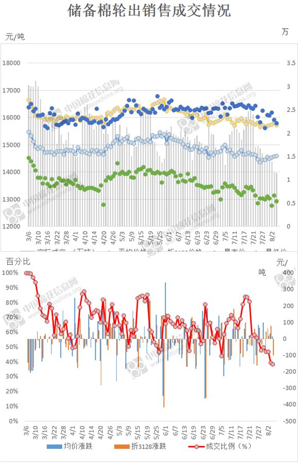 2017年3月6日至8月4日,儲(chǔ)備棉輪出累計(jì)成交214.63萬噸,成交率66.77%。