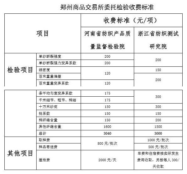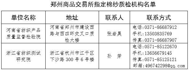 二、棉紗指定質(zhì)檢機(jī)構(gòu)為河南省紡織產(chǎn)品質(zhì)量監(jiān)督檢驗(yàn)院和浙江省紡織測(cè)試研究院,相關(guān)聯(lián)系方式及檢驗(yàn)費(fèi)用如下: