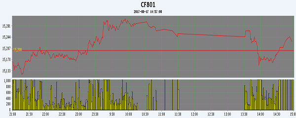8月17日隔夜鄭棉CF1801合約回升,今日早盤增倉快速?zèng)_高,隨后高位震蕩,午后在平倉盤的壓力下回落,尾盤在多頭買盤推動(dòng)下反抽,日線形成陽線。日內(nèi)成交量放大,持倉量增加?;久媲闆r:現(xiàn)貨市場弱勢調(diào)整,儲(chǔ)備棉轉(zhuǎn)售相對(duì)較多,商談成交一般,疆棉長度27-28強(qiáng)力26-27級(jí)報(bào)價(jià)在14900-15100元/噸。而現(xiàn)貨市場亦呈現(xiàn)微跌趨勢,河北地產(chǎn)3128級(jí)提貨價(jià)格在15000元/噸毛重,雙28級(jí)手摘疆棉價(jià)格在16000元/噸,廠家多數(shù)剛需偏向儲(chǔ)備棉。且因儲(chǔ)備棉底價(jià)較低,有采購儲(chǔ)備棉拋期貨的操作。