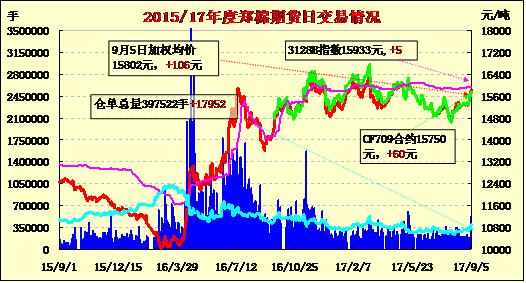 9月5日隔夜鄭棉CF1801合約沖高回落,隨后低位震蕩換手,今日早盤(pán)延續(xù)盤(pán)整走勢(shì),午前在多頭買(mǎi)盤(pán)推動(dòng)下走高,午后重心上移震蕩,尾盤(pán)收于日高,日線形成長(zhǎng)下影線的陽(yáng)線。日內(nèi)成交量萎縮,持倉(cāng)量繼續(xù)增加。基本面情況:受周末儲(chǔ)備棉輪出政策調(diào)整及下游棉紗局部漲價(jià)影響,鄭棉期貨出現(xiàn)大漲,最高盤(pán)中沖至15975,漲幅在3.5-4%之間。受此影響,現(xiàn)貨市場(chǎng)心態(tài)也略有好轉(zhuǎn),但價(jià)格仍基本維持,因貿(mào)易商不允許參與拍儲(chǔ),且新疆當(dāng)?shù)丶徠竺媾R新舊棉花交替階段,有出現(xiàn)在內(nèi)地采購(gòu)棉花現(xiàn)象,市場(chǎng)試探性詢(xún)盤(pán)略增加。而新年度籽棉零星收購(gòu),據(jù)悉,目前北疆籽棉收購(gòu)價(jià)在7.2-7.3元/公斤左右,目前量不多,已有軋花廠試軋一兩批,雙29級(jí)試探性銷(xiāo)售價(jià)16400-16500元/噸公定。