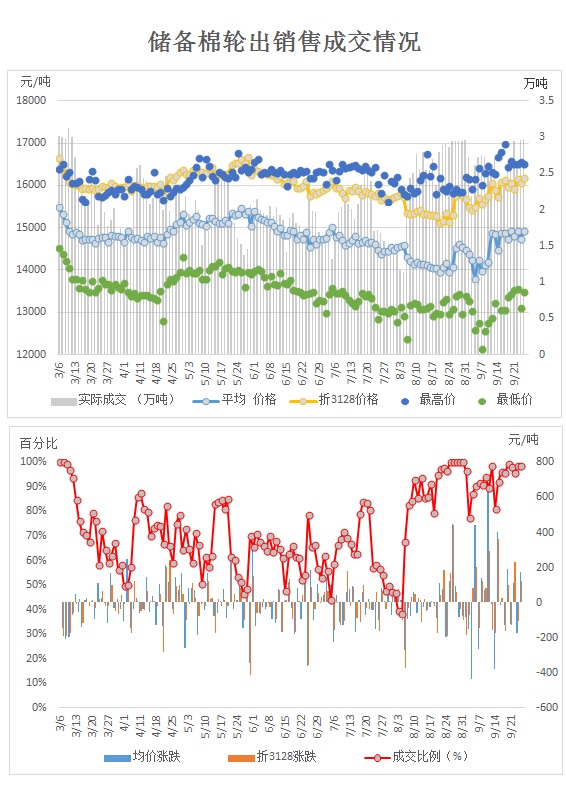 9月26日儲備棉輪出銷售資源30143.6543噸,實際成交29670.7686噸,成交率98.43%。成交平均價格14917元/噸(較前一日價格漲175元/噸);折3128價格16172元/噸(較前一日價格漲124元/噸)。