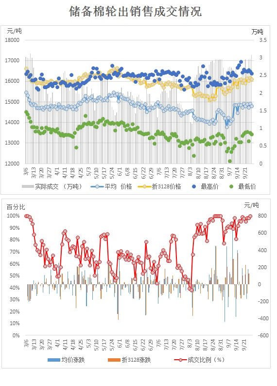 9月27日儲備棉輪出銷售資源30796.9172噸,實際成交30796.9172噸,成交率100.00%。成交平均價格14810元/噸(較前一日價格跌107元/噸);折3128價格16101元/噸(較前一日價格跌71元/噸)。