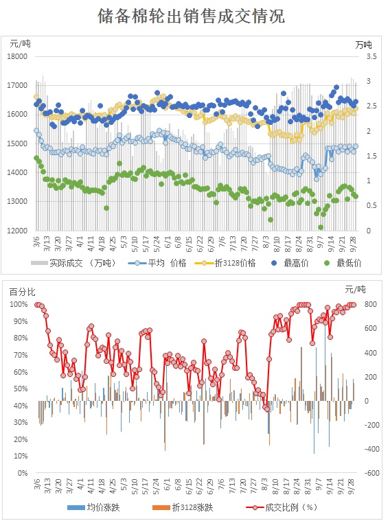 9月29日儲(chǔ)備棉輪出銷(xiāo)售資源29790.8252噸,實(shí)際成交29790.8252噸,成交率100.00%。成交平均價(jià)格14923元/噸(較前一日價(jià)格跌70元/噸);折3128價(jià)格16219元/噸(較前一日價(jià)格跌30元/噸)。