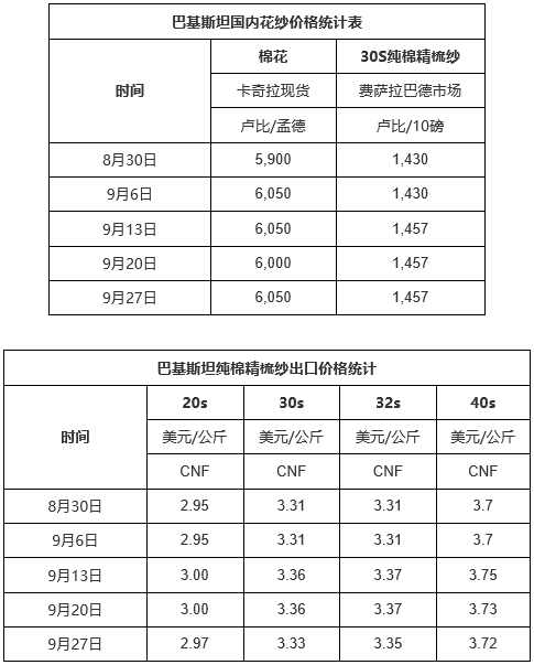 9月21-27日一周,巴基斯坦棉花和棉紗價(jià)格雙雙下跌,滌棉紗價(jià)保持堅(jiān)挺。