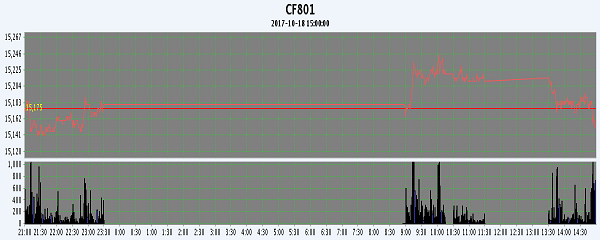 18日隔夜鄭棉CF1801合約下滑,今日早盤在空頭回補推動下回升,此后區(qū)間震蕩,午后小幅下滑,日線形成陽線星。日內成交量萎縮,持倉量減少?;久媲闆r:新棉逐步上市,市場報價增多,新疆2129級報價在16500-16700元/噸毛重出廠,零星有小單商談成交,下游紡企多觀望為主。而國儲棉商談仍占據主導,地產主流價格在14300-14500元/噸。整體下游紡企前期拍儲后多已備好近3個月庫存量,近期對棉花需求不多,多零星采購為主。因十九大因素,新疆貨運限制嚴重,據悉,軋花廠表示現(xiàn)汽運難尋,新疆牌照現(xiàn)在一律不能出疆。