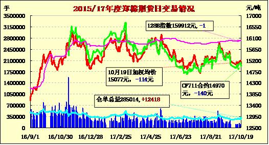 19日隔夜鄭棉CF1801合約盤整,今日早盤在空頭賣盤打壓下震蕩下滑,午后在空頭回補(bǔ)與多頭買盤支撐下脫離低點(diǎn),尾盤在平倉打壓下收低,日線形成陰線。日內(nèi)成交量放大,持倉量增加。基本面情況:目前現(xiàn)貨價(jià)格基本維持,南疆手摘棉價(jià)16000-16600元/噸毛重自提,零星小單商談成交。長絨棉市場價(jià)格略有小幅上浮,137級價(jià)格在21500元/噸到廠,新年度籽棉收購在8-8.3元/公斤,成本與陳棉價(jià)格倒掛。市場國儲棉轉(zhuǎn)售仍占據(jù)主導(dǎo),商家盡量出貨為新棉騰出庫存及資金,山東地產(chǎn)雙28級報(bào)價(jià)在14500-14800元/噸公定自提。