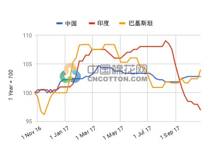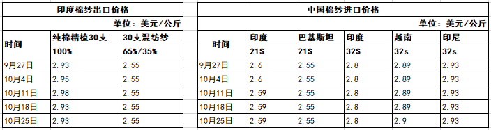 10月19-25日一周,印度排燈節(jié)結(jié)束后,棉紗價(jià)格進(jìn)一步下跌。據(jù)了解,在棉花和棉紗價(jià)格大幅下跌后,印度南部地區(qū)成交開始活躍。