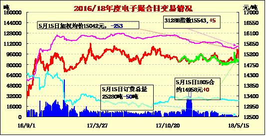 15日電子撮合交易成交量較前一交易日減少,合同均價漲跌不一。其中MA1806成交量較大,為120噸;活躍交投的合同多集中于中遠期合同,MA1808訂貨量最大,累計訂貨量為7270噸。當(dāng)日2017/18年度儲備棉輪出第一節(jié)交易時段成交0.82萬噸,流拍0.68萬噸。期貨市場自4月底以來逐步拉升,一部分原因來自于現(xiàn)貨市場近期的回暖,成交量有所增加,價格穩(wěn)中有漲。