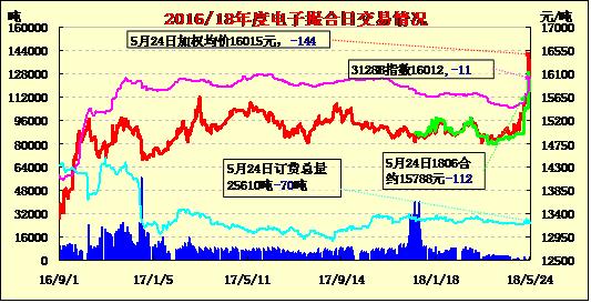 5月24日電子撮合交易成交量較前一交易日減少,漲跌互現(xiàn)。其中MA1806成交量較大,為390噸;活躍交投的合同多集中于中遠(yuǎn)期合同,MA1808訂貨量最大,累計訂貨量為7170噸。5月24日2017/18年度儲備棉輪出第一節(jié)交易時段成交1.5萬噸,全部成交。最高成交價16710元/噸(2012年度資源,加價幅度1700元/噸),從上午的成交情況看,單捆最高加價幅度為2200元/噸,單捆最低加價幅度為20元/噸。