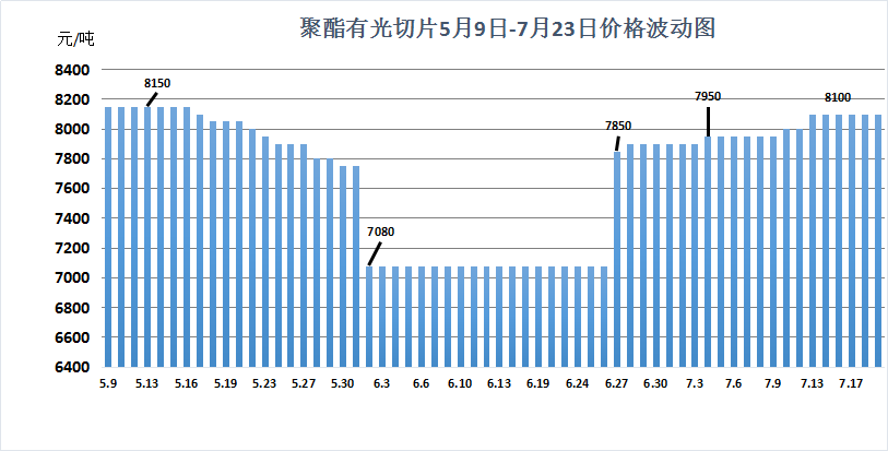 5月9日至7月23日,聚酯有光切片市場大起伏漲跌暫告一段落,期間最高報價8150元/噸,最低報價7080元/噸。6月2日至6月26日,市場報價一直徘徊在7080元/噸左右。目前聚酯有光切片市場呈盤整態(tài)勢,報價平穩(wěn)為8100元/噸左右。