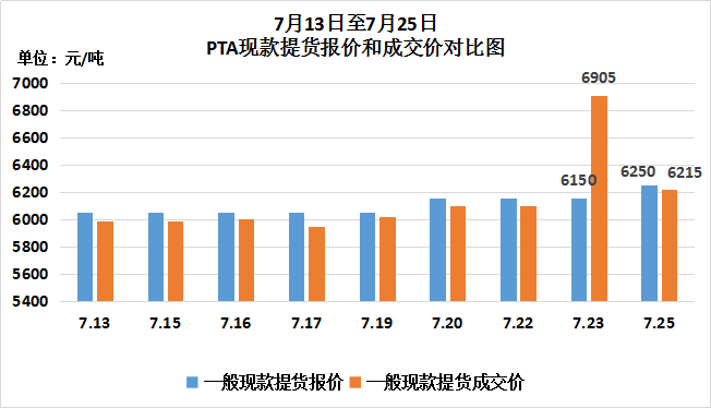 自PTA現(xiàn)貨市場(chǎng)進(jìn)入淡季以來,6月至7月中旬PTA現(xiàn)款報(bào)價(jià)與成交價(jià)基本持平,近日PTA現(xiàn)貨市場(chǎng)現(xiàn)款提貨成交價(jià)上下波動(dòng)幅度較大。7月23日,現(xiàn)款提貨報(bào)價(jià)6150元/噸,現(xiàn)款提貨成交價(jià)6905元/噸,現(xiàn)款提貨報(bào)價(jià)高于現(xiàn)款提貨成交價(jià)755元/噸,然而7月25日現(xiàn)款提貨成交價(jià)又大幅下跌,基本恢復(fù)原價(jià),現(xiàn)款提貨成交價(jià)6215元/噸,短短幾天內(nèi),現(xiàn)款提貨成交價(jià)經(jīng)歷大起大落。