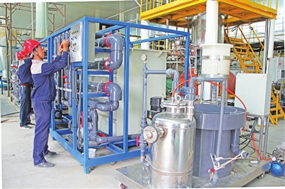 工人們?cè)谥性囓囬g調(diào)試生產(chǎn)紙漿的水處理設(shè)備。