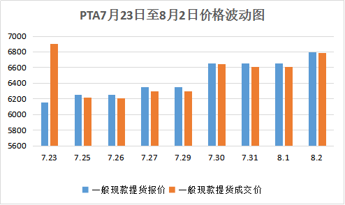 7月25日至8月2日成交價低于報價,PTA報價、成交價價格波動在400元內(nèi),8月2日,一般現(xiàn)款提貨報價6800元/噸較前一天上漲180元/噸,一般現(xiàn)款提貨成交價6785元/噸較前一天上漲150元/噸,盡管PTA社會庫存連續(xù)下降、PTA價格小幅度上漲,企業(yè)還是偏于理性采購。作為PTA的下游聚酯產(chǎn)品,7月23日至8月2日聚酯切片半光、有光價格持續(xù)小幅上漲,8月2日聚酯切片半光8675元/噸,聚酯切片有光8850元/噸。