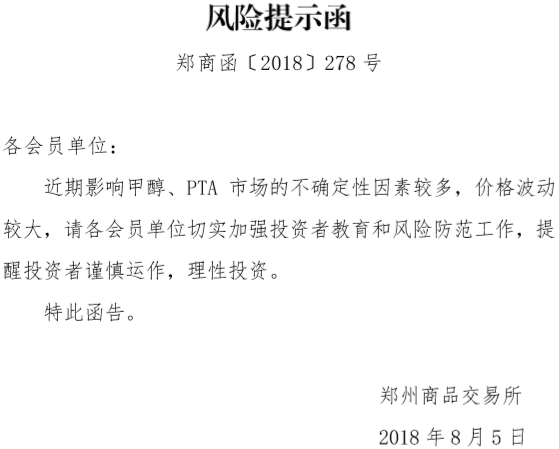 8月5日,鄭商所向各會員單位發(fā)布風險提示函。該提示函稱,近期影響PTA市場的不確定性因素較多,價格波動較大,請各會員單位切實加強投資者教育和風險防范工作,提醒投資者謹慎運行,理性投資。