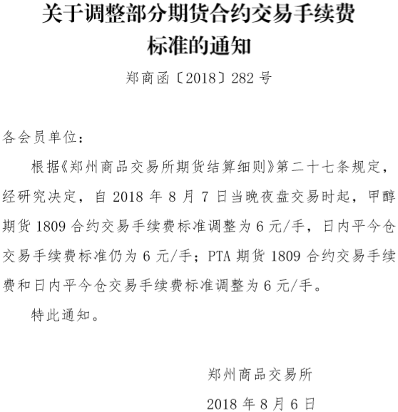 鄭商所8月6日宣布,自8月7日當晚夜盤交易時起,PTA期貨1809合約交易手續(xù)費和日內(nèi)平今倉交易手續(xù)費標準調(diào)整為6元/手。(標題:鄭商所發(fā)布PTA市場風險提示函及調(diào)整PTA期貨交易手續(xù)費)