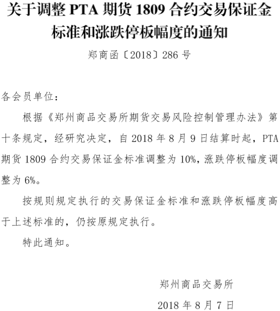 鄭商所8月7日官網(wǎng)發(fā)布消息,自8月9日結(jié)算時起,PTA期貨1809合約交易保證金標(biāo)準(zhǔn)調(diào)整為10%,漲跌停板幅度調(diào)整為6%。