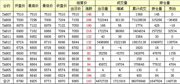 主力TA809合約當(dāng)日交易走勢