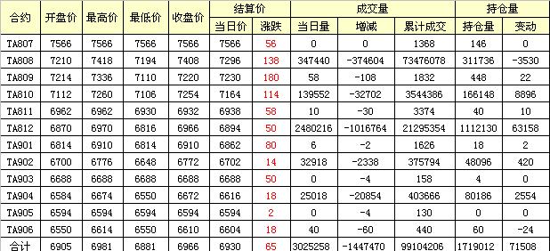 主力TA809合約當日交易走勢
