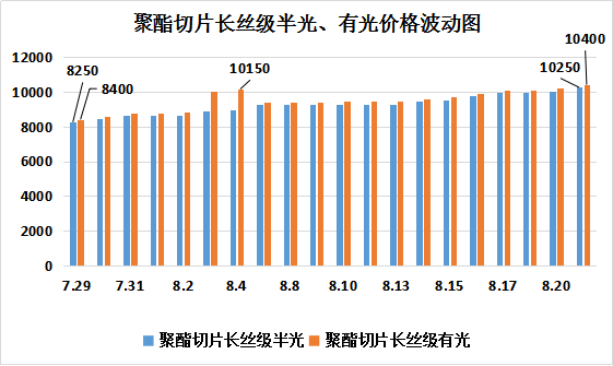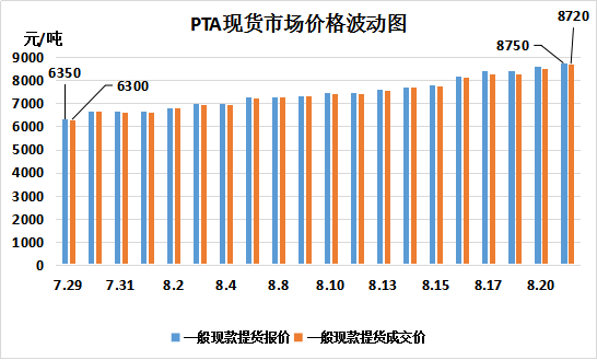 PTA現(xiàn)貨市場成交價,自8月以來,每天的上漲幅度在100-300元之間,8月1日PTA現(xiàn)貨市場成交價為6605元/噸,8月21日PTA現(xiàn)貨市場成交價為8720元/噸,聚酯切片長絲級半光、有光價格隨著原料的上漲也呈現(xiàn)持續(xù)走高的態(tài)勢,聚酯切片長絲級有光8月17日達(dá)到了10100元/噸,8月21日10400元每噸,相比月初,上漲了1600元。